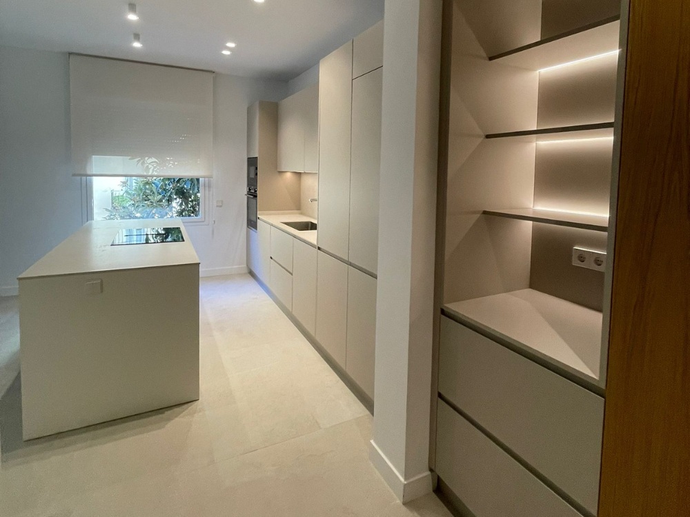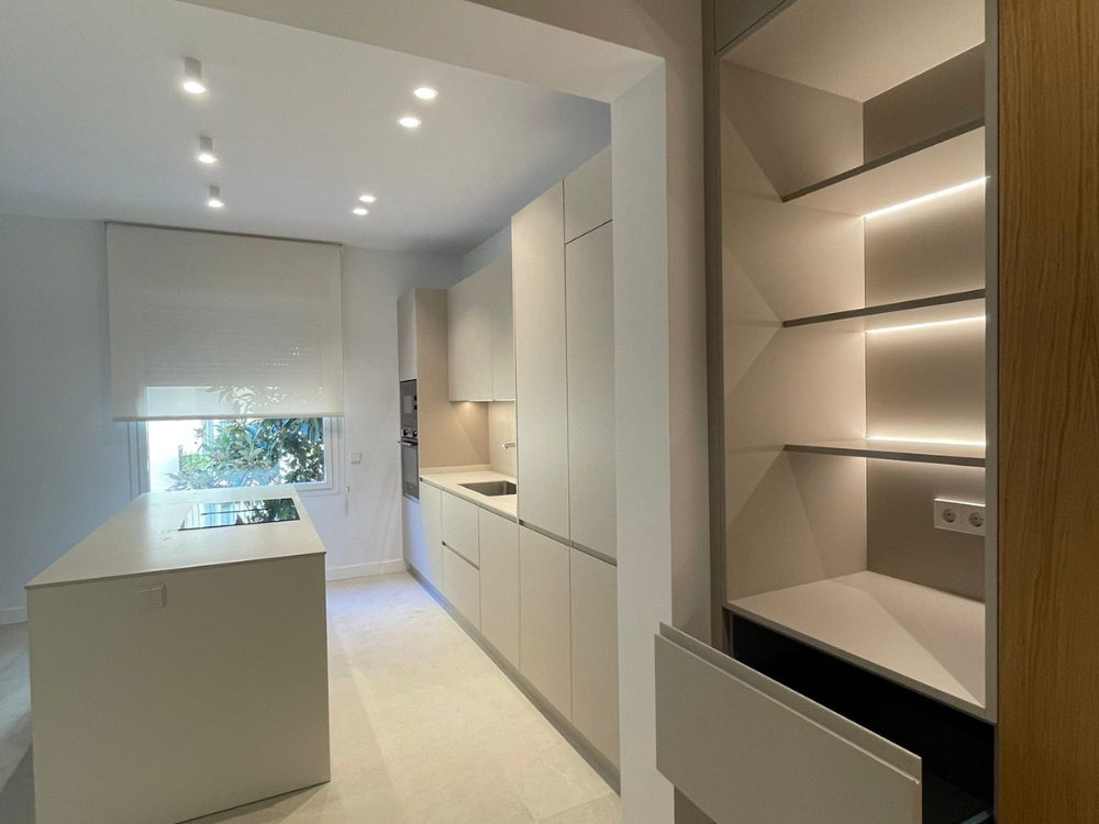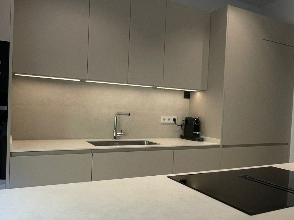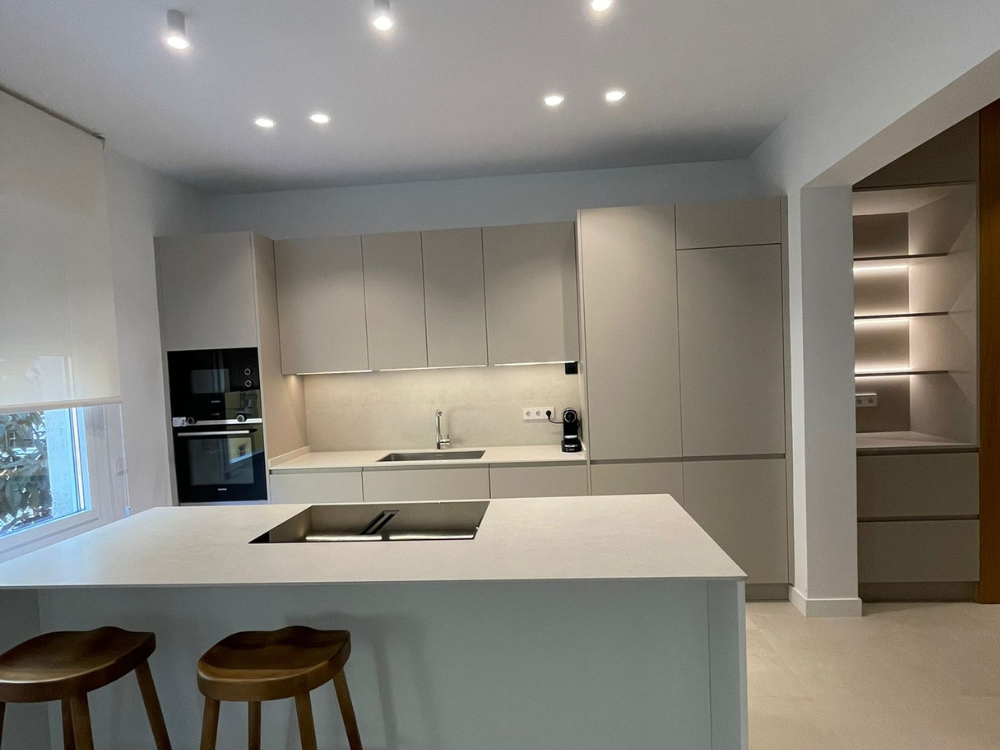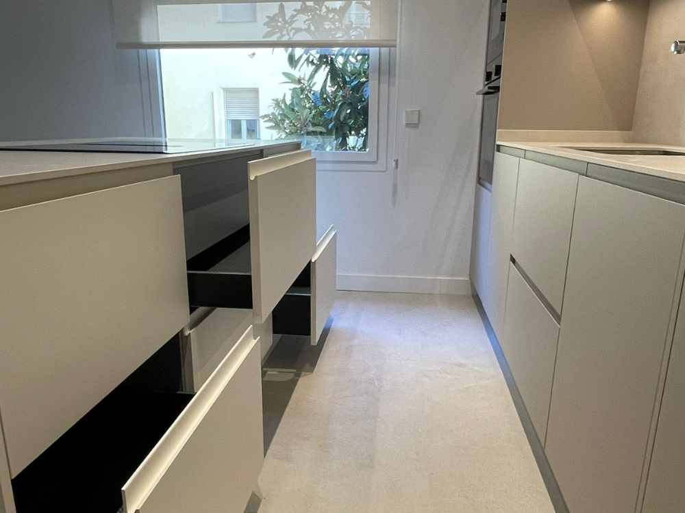 Proyecto C/ Lagasca es un claro ejemplo de equilibrio entre diseño contemporáneo y calidez. La cocina se articula en torno a una encimera Laminam de la colección Fokos, modelo Talco, con un elegante acabado mate y un espesor de 1,2 cm, que aporta una estética sofisticada y minimalista.