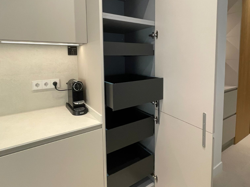 El mobiliario combina puertas en PET acabado blanco roto, que aportan luminosidad y amplitud visual, con PET acabado Terra, introduciendo un contraste natural y envolvente. Esta cuidada selección de materiales y tonos genera un espacio funcional, armonioso y atemporal, pensado para disfrutar del diseño sin renunciar a la practicidad.